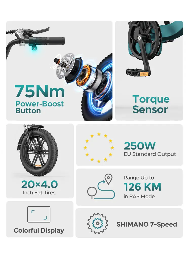 The 20*4.0 inch fat tires offer superior traction and stability, allowing you to ride confidently on sand, snow, and rough trails. These wide tires enhance comfort and safety, reducing the impact of uneven surfaces.